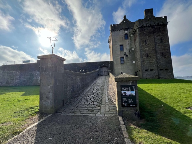 Stone pathway leading to the entrance of Broughty Castle, a 15th-century coastal fortress in Dundee, under a bright blue sky with sun flare.