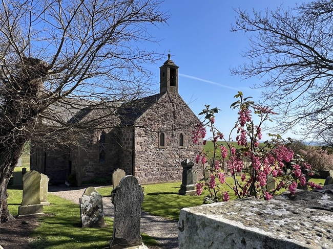 Historic stone church with a small bell tower, surrounded by gravestones and blooming pink flowers under a clear blue sky.