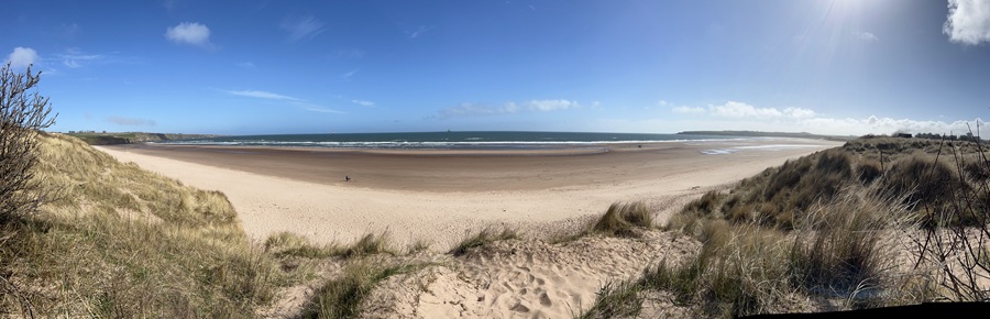 Wide panoramic view of Lunan Bay, showing golden sand dunes in the foreground, a vast open beach, and a gently curving shoreline under a clear blue sky.