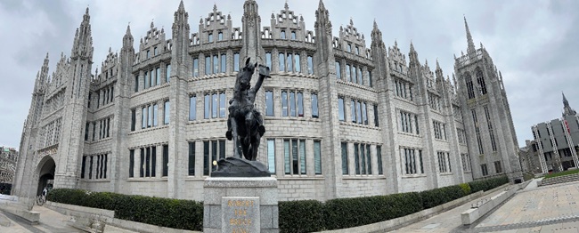 Panoramic view of Marischal College in Aberdeen, Scotland, featuring its grand Gothic architecture and the mounted statue of Robert the Bruce in the foreground.