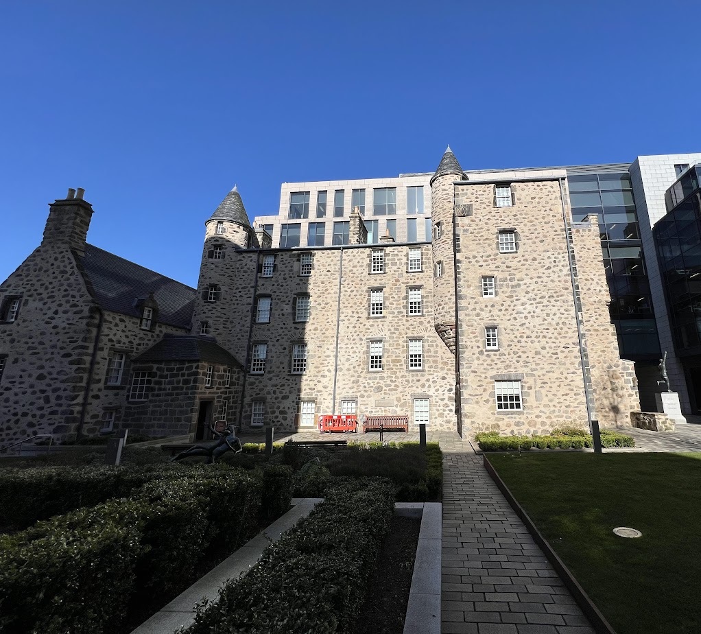 Provost Skene’s House in Aberdeen, Scotland, with historic granite architecture and modern office buildings in the background under a clear blue sky.