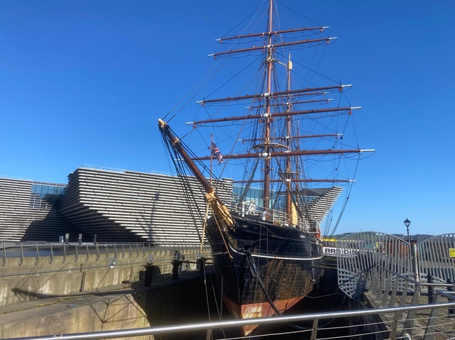 Historic RRS Discovery ship docked beside the V&A Dundee museum on the Scottish coast under a clear blue sky.