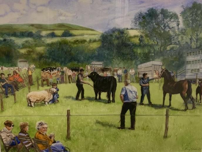 Painting of a rural livestock show with spectators and handlers presenting animals in a grassy ring surrounded by hills.